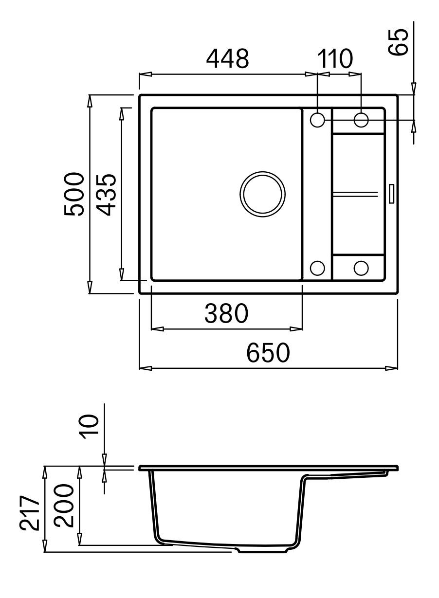 Integrovaná oblast pro příslušenství v odkapávači, vybavená předvrtanými otvory, které vám umožňují instalovat doplňky: excentrické ovládání odpadu, dřezovou baterii s vytahovací sprchou a dávkovač saponátu.