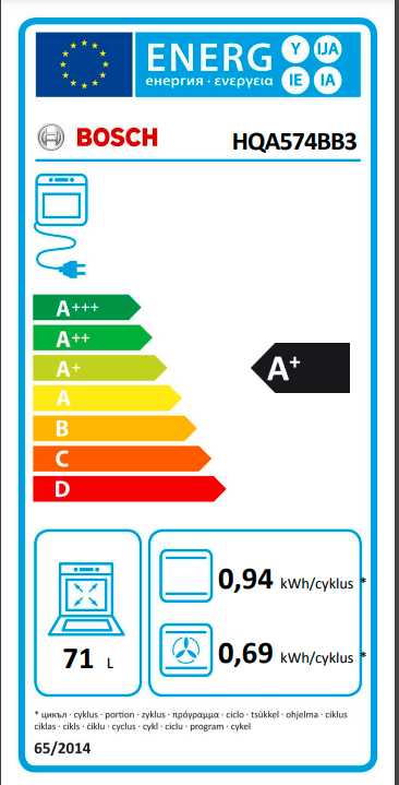 spotřeba energie na cyklus při konvenčním ohřevu:0.9 kWh(na stupnici třidy energetické účinnosti od A+++ do D)