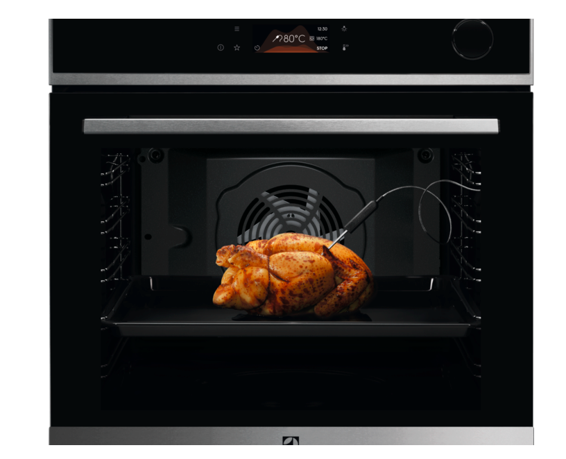 Teplotní sonda: Teplotní sonda je podstatná pro rozhodnutí, zda je již pokrm připraven. Je přímo spojena s ovládacím panelem a pracuje jako teploměr. Zasunete sondu do středu masa nebo ryby, nastavíte teplotu a až bude pokrm upečen tak, jak si přejete, budete na to upozorněni.